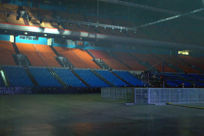 Зал «Олимпийского» пока пустует. Трибуны темны и безлюдны…