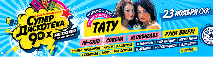 Впервые после долгого перерыва специально для Супердискотеки Радио Рекорд выступит вместе группа t.A.T.u., а мы зажжем под их «Нас не догонят», «Я сошла с ума» и другие хиты.